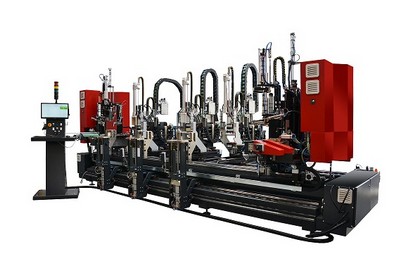 Vysoko presný stroj, ktorý umožňuje súčasné zváranie uhlov 90 ° a krížov „T“, Cross alebo „H“ (v ľubovoľnej kombinácii) a zváranie s variabilným uhlom medzi 35 ° a 180 ° v jednom pracovnom cykle.