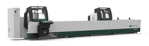 Kettős fejű fűrészgép Ø 550 mm-es volfrámkarbid pengékkel a mozgó fej motoros mozgatásával és a fej billentésének elektronikus vezérlésével Kapható 4 - az 5. és a 6,6 méteres változatban