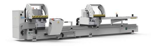Double-head saw for complex angles with motorized movement of the moving head Available in 5 and 6.6 meter versions