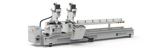 Double-head saw with Ø 550 mm tungsten carbide blades with motorized movement of the moving head and electronic control of the head tilt Available in 4 - 5 and 6.6 meter versions