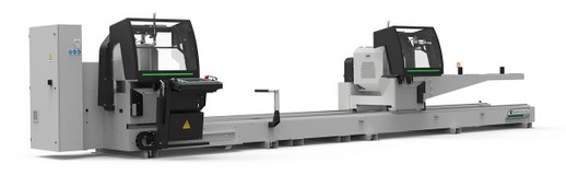 Kettős fejű fűrészgép Ø 550 mm-es volfrámkarbid pengékkel a mozgó fej motoros mozgatásával és a fej billentésének elektronikus vezérlésével Kapható 4 - az 5. és a 6,6 méteres változatban