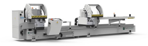 Kettős fejű fűrészgép ø 550 mm-es volfrámkarbid pengével, a mozgó fej motoros mozgatásával és a fej dőlésének elektropneumatikus vezérlésével Kapható 4 - az 5. és 6,6 verzió